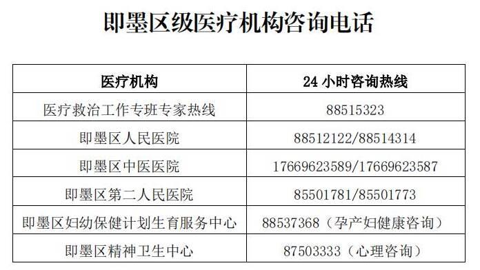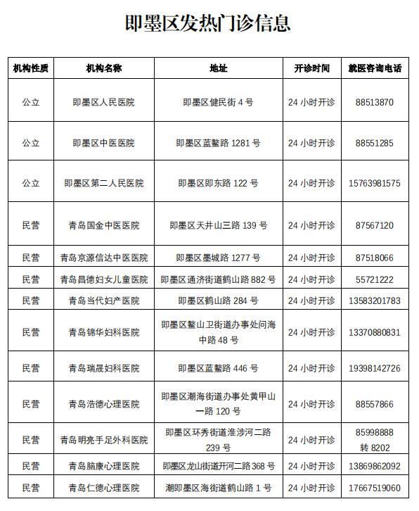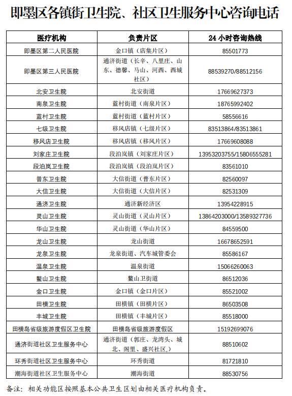 (藥包發(fā)放點(diǎn)隨時(shí)可能有所變動(dòng),請市民隨時(shí)關(guān)注官方相關(guān)告示),現(xiàn)將即墨區(qū)級(jí)醫(yī)療機(jī)構(gòu)咨詢電話、各鎮(zhèn)街衛(wèi)生院等信息予以公布。
