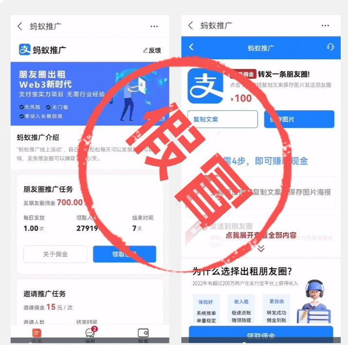 支付寶沒有“螞蟻推廣”“支付寶推廣”等項(xiàng)目,也沒有“朋友圈出租”等賺錢活動。此類活動均為詐騙。