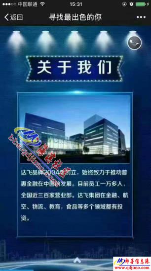 公司簡介:達(dá)飛品牌由高云紅先生在2004年創(chuàng)立,始終致力于推動(dòng)普惠金融在中國的發(fā)展。在過去的10余年中,達(dá)飛堅(jiān)持以普惠為目標(biāo),以用戶為中心,以誠信為基礎(chǔ),基于用戶需求持續(xù)創(chuàng)新,贏得了客戶的尊重和信賴,從一家起步于秦皇島的單一品牌企業(yè),穩(wěn)步發(fā)展為擁有多子品牌(達(dá)飛金控、達(dá)飛財(cái)富、達(dá)飛金融、文子、達(dá)飛微金)的綜合性普惠金融服務(wù)企業(yè)。如今,達(dá)飛的業(yè)務(wù)已覆蓋全國25個(gè)省、100多個(gè)城市,共成立四百余家門店為上百萬用戶提供金融服務(wù)。